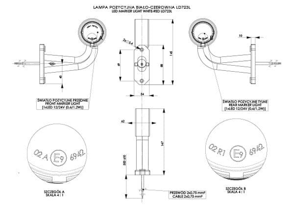 Lampa obrysowa biało czerwona lewa krótka łamana led LD723/L