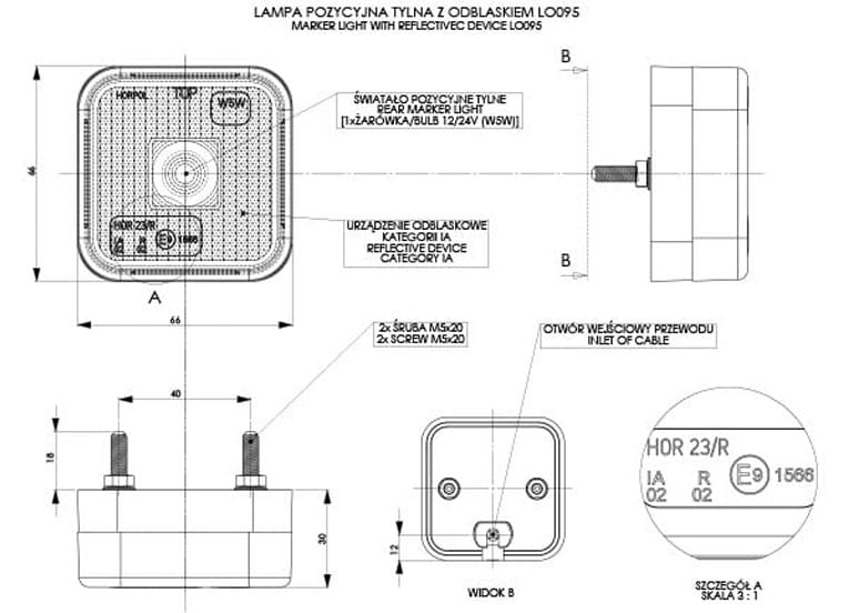 Lampa obrysowa kwadratowa z odblaskiem czerwona żarówkowa LO095