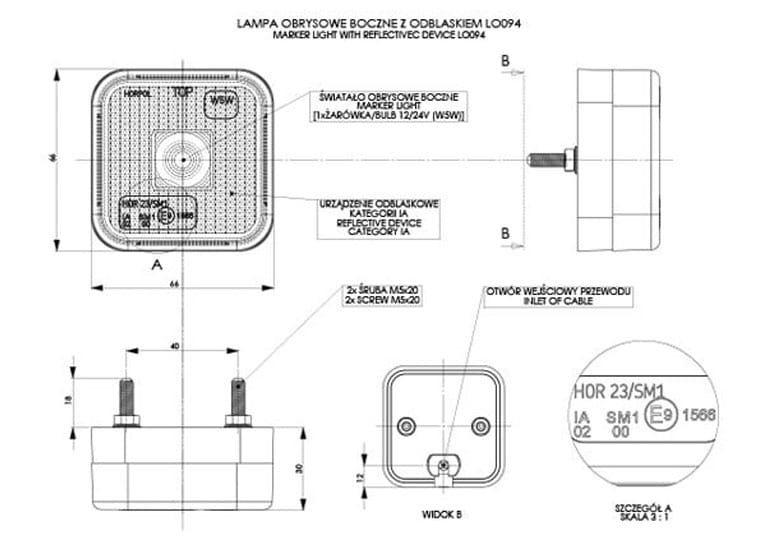 Lampa obrysowa kwadratowa z odblaskiem pomarańczowa żarówkowa LO094