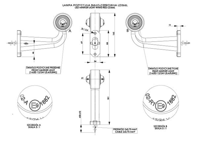 - Przewód: 2×0,75 mm2; długość przewodu 0,45 m