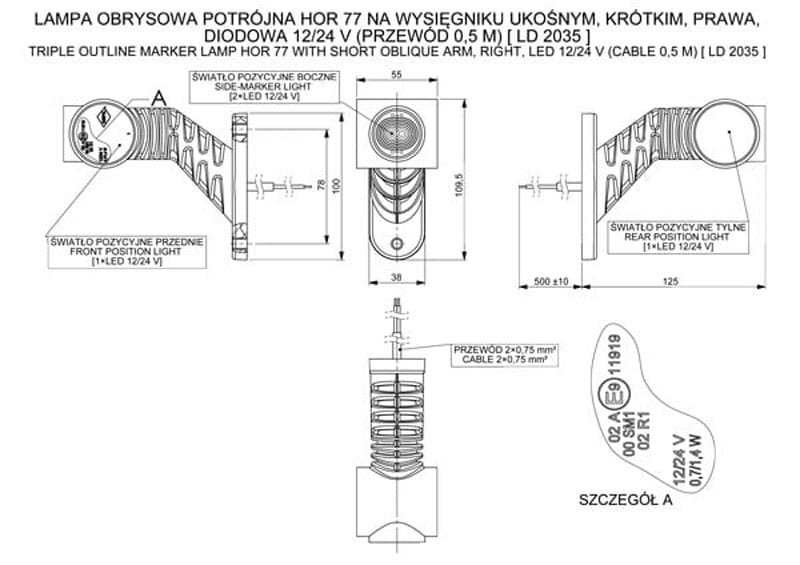 Lampa obrysowa potrójna na wysięgniku ukośnym krótkim prawa LD2035