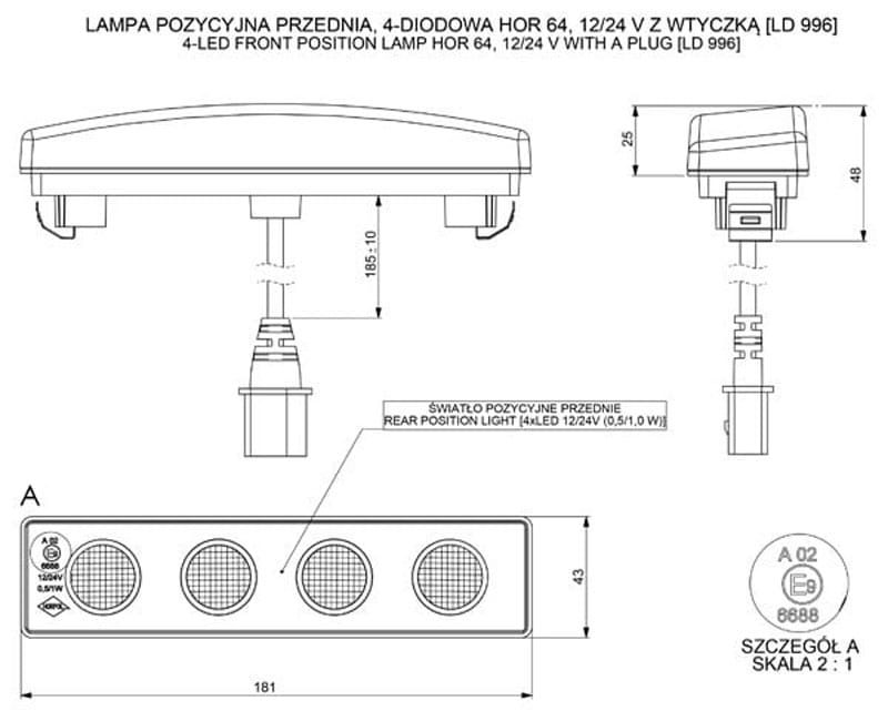 Lampa obrysowa pozycyjna przednia 4-diodowa z wtyczką LD996