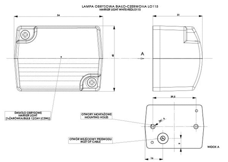 Lampa obrysowa prostokątna mała biało-czerwona żarówkowa LO115