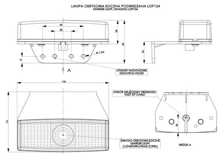 Lampa obrysowa prostokątna zatrzask podwieszana pomarańczowa żarówkowa LOP124
