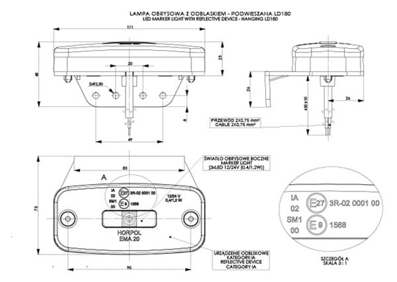 Lampa obrysowa z odblaskiem podwieszana pomarańczowa led LD180