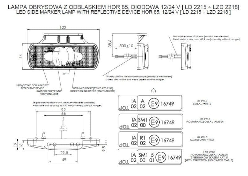Lampa obrysowa z odblaskiem pomarańczowa led LD2216