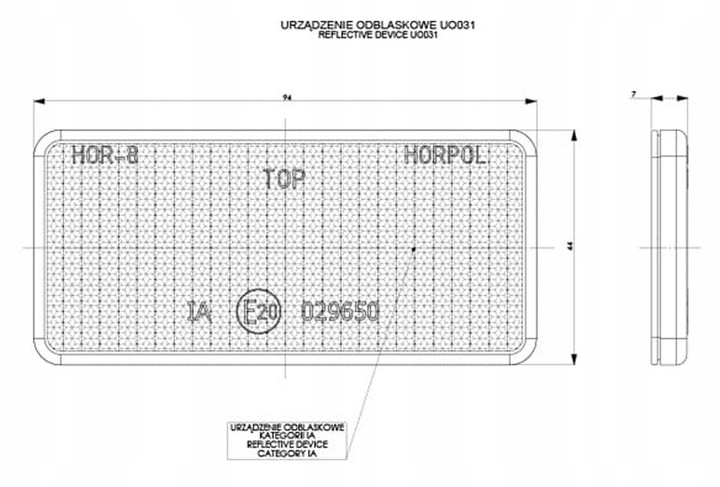 - Powierzchnia odblasku o wymiarach 44x94 mm