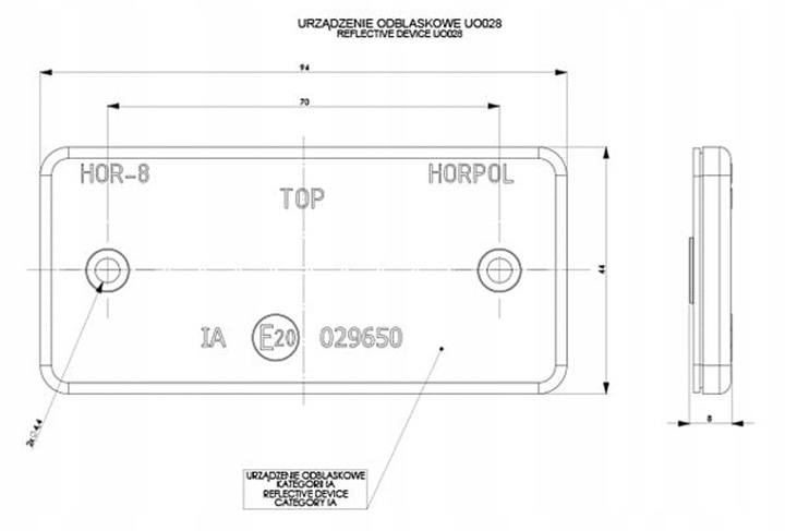 - Powierzchnia odblasku o wymiarach 44x94 mm